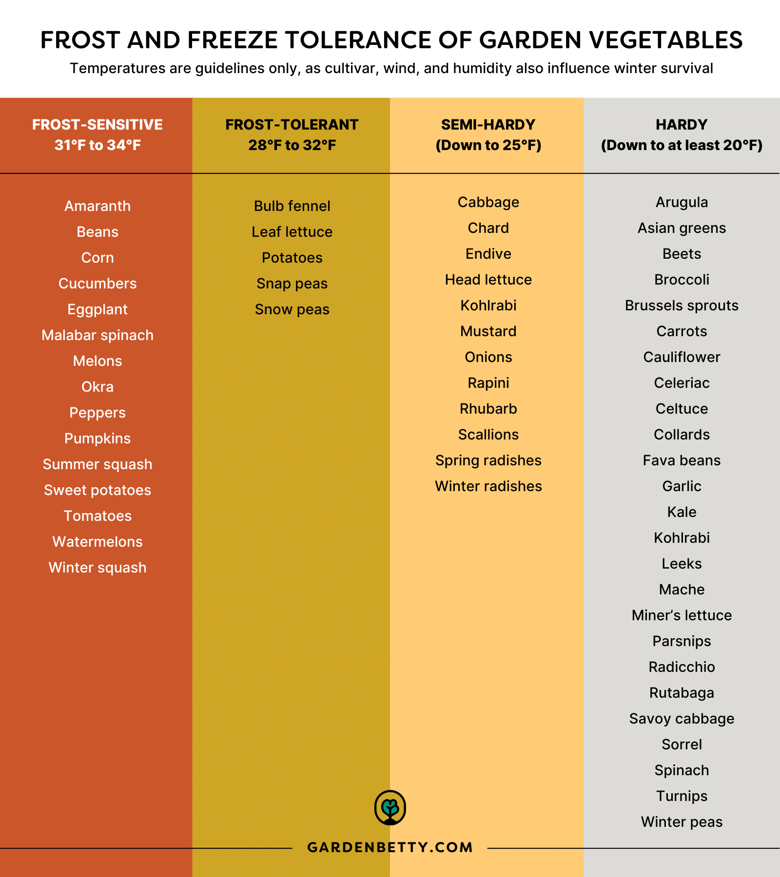 For the last six winters, I've been growing a variety of leafy greens and herbs in my backyard—without a greenhouse. I can harvest salads when temperatures are down in the teens Fahrenheit and while plants do grow more slowly in winter, they still produce (and often taste even better when they're harvested after a few brutally cold nights). A lot of people think that without a greenhouse, gardening in winter is impossible if you live below USDA hardiness zone 8. I mean, it's not hard to see from this chart I made, which lists the frost and freeze tolerance of some common garden vegetables. Are you out of luck once it drops to 20°F or below? Surprisingly, no! If you're curious how I'm able to grow food all through winter (in my zone 5 microclimate), I'll show you how to cheat winter and keep your garden productive.